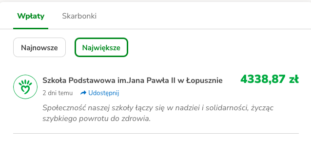 Cała kwota została przekazana na konto fundacji Siepomaga i zostanie przeznaczona na leczenie oraz rehabilitację pani Kamili Oleś, wnuczki emerytowanej pracownicy naszej szkoły, która podczas wakacji uległa poważnemu wypadkowi komunikacyjnemu.