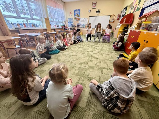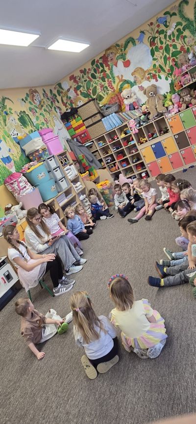 Przedszkolaki z dużym zainteresowaniem wysłuchały opowieści o przygodach rodzeństwa w lesie oraz o tajemniczym domku z piernika. Podczas czytania dzieci aktywnie uczestniczyły w spotkaniu – odpowiadały na pytania dotyczące treści baśni, przewidywały dalszy przebieg wydarzeń oraz dzieliły się swoimi refleksjami na temat postępowania bohaterów. Wykazały się bardzo dobrą pamięcią i zrozumieniem tekstu.