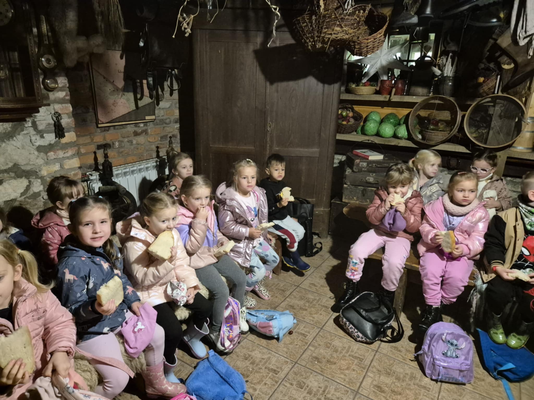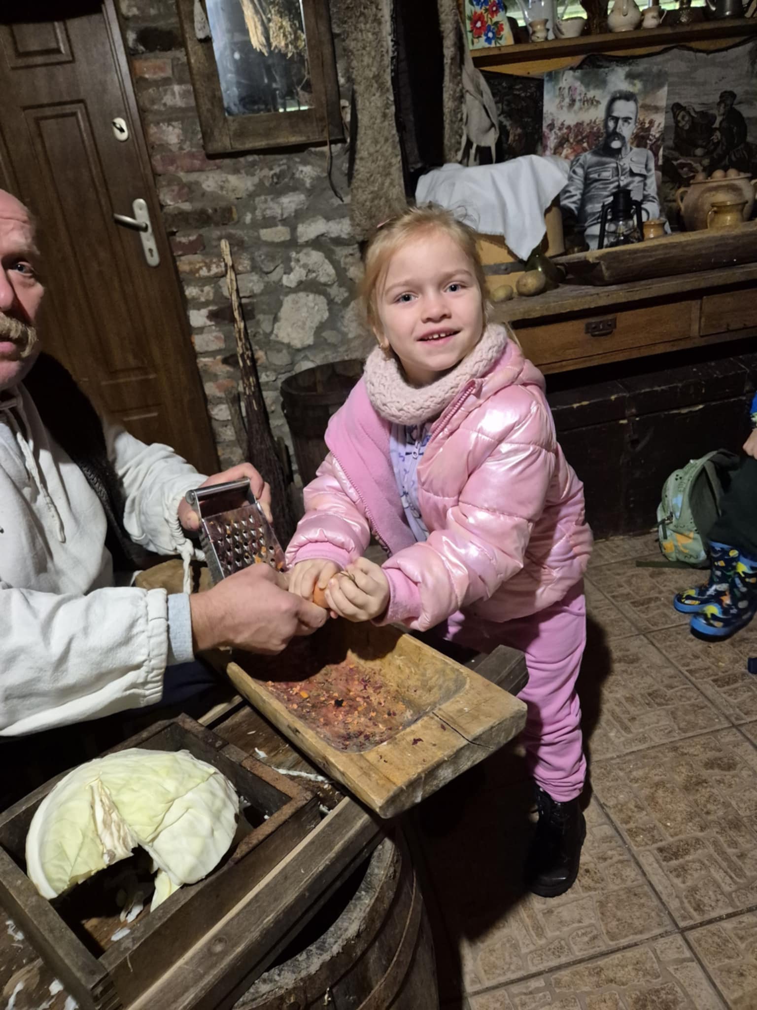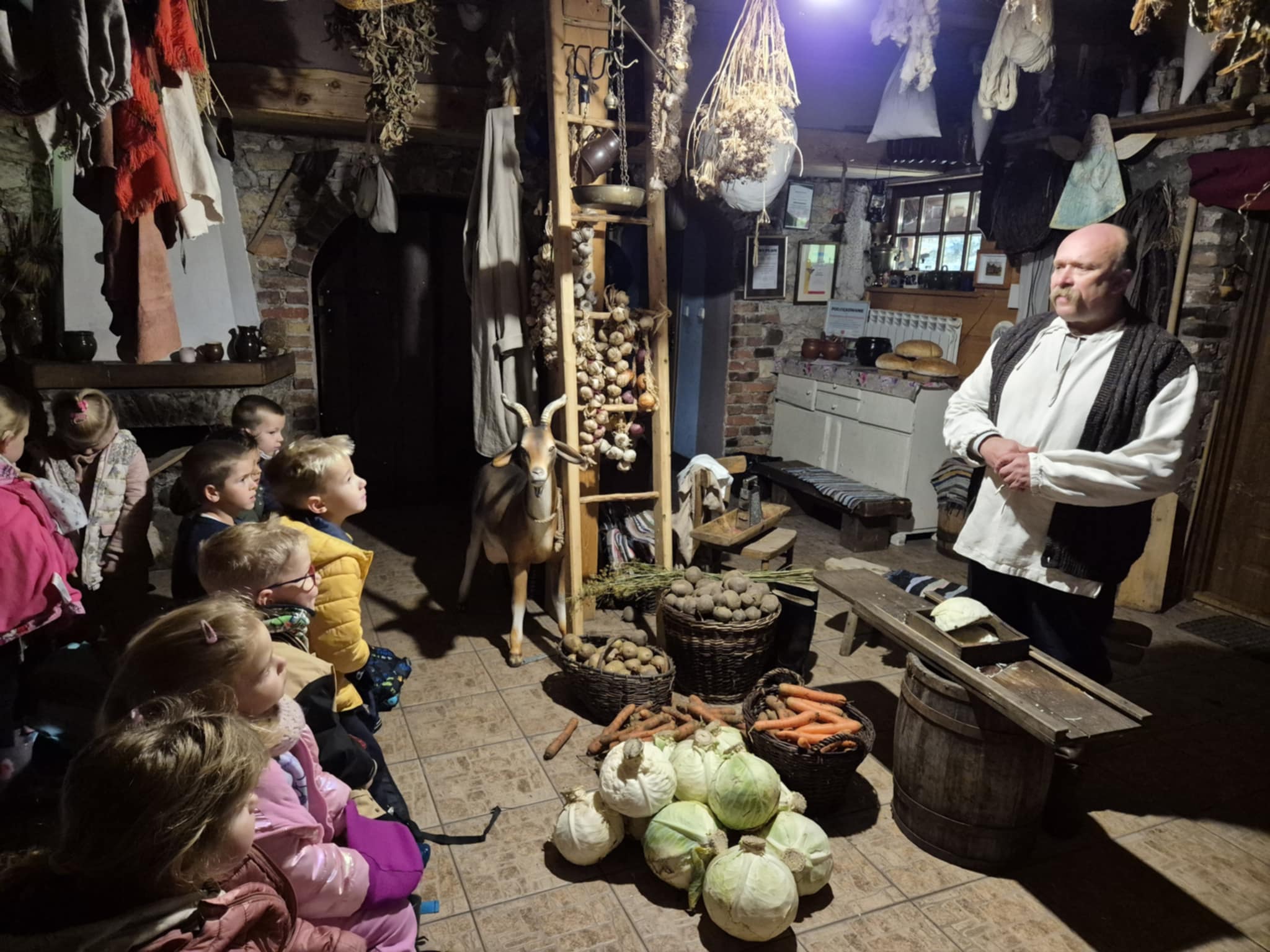 Podczas pobytu w zagrodzie przedszkolaki miały okazję dowiedzieć się, jak wyglądało życie na wsi wiele lat temu. Dzieci poznały dawne sposoby przechowywania żywności, takie jak przechowywanie warzyw w piwnicach i kopcach, wędzenie mięsa czy suszenie owoców i ziół. Dzięki temu zrozumiały, jak radzono sobie bez lodówek i współczesnych urządzeń kuchennych. Z dużym zainteresowaniem obserwowały kolejne etapy kiszenia kapusty – od szatkowania, poprzez solenie, aż po ugniatanie w beczce. Dzieci z zaangażowaniem pomagały w pracy, świetnie się przy tym bawiąc. W trakcie warsztatów przedszkolaki poznały również dawne zastosowania buraka – dowiedziały się, że kiedyś używano go nie tylko w kuchni, ale także do barwienia tkanin czy nawet do malowania policzków przez kobiety, które w ten sposób tworzyły naturalny rumieniec.