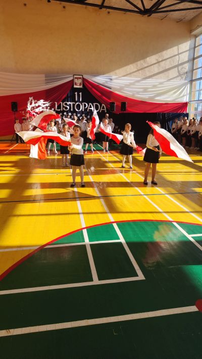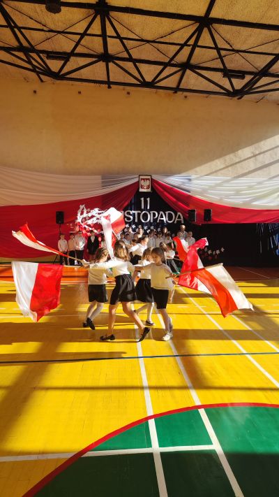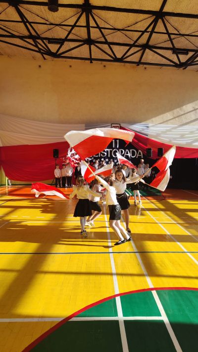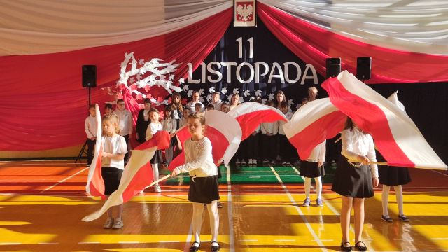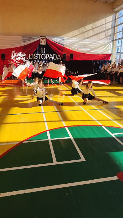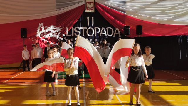 W wierszach recytowanych przez uczniów pojawiły się także symbole narodowe. Jednakże w najbardziej ekspresyjny sposób o barwach narodowych – bieli i czerwieni – przypomniały dziewczynki z klasy II b w zaprezentowanym układzie choreograficznym, który można by nazwać „tańcem z flagami”.