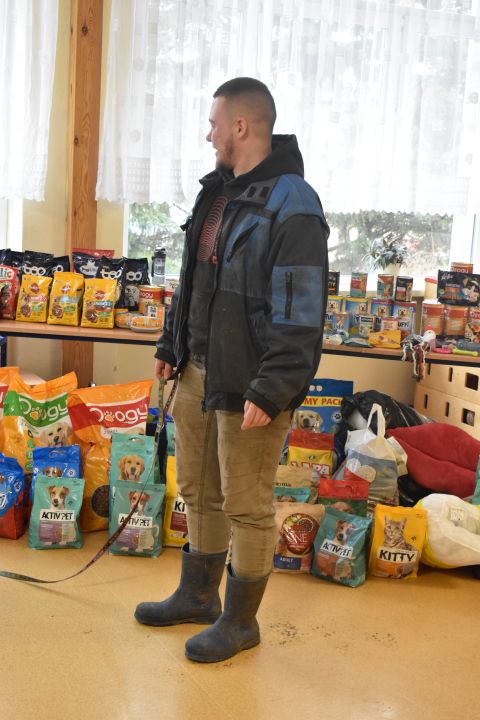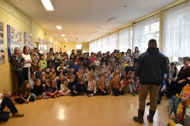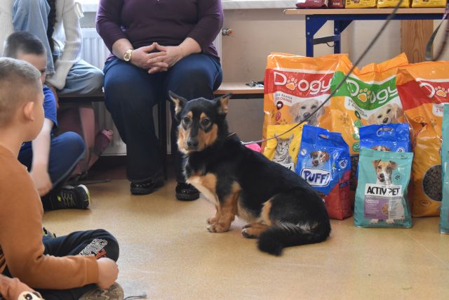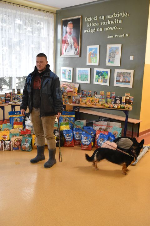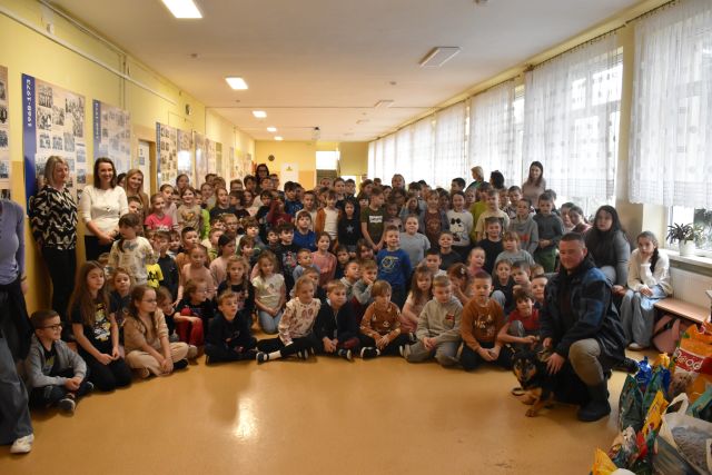 16 grudnia w naszej szkole odbyła się niezwykle miła i pouczająca wizyta. Odwiedzili nas behawiorysta Kaspian wraz z wyjątkowym, czworonożnym gościem – psem Frugo, który na co dzień mieszka w schronisku w Rytlowie. Goście przyjechali, aby podziękować uczniom oraz Samorządowi Uczniowskiemu za zorganizowanie zbiórki karmy dla podopiecznych fundacji. W spotkaniu z miłymi gośćmi udział wzięli uczniowie klas młodszych. Pan Kaspian w ciekawy i przystępny sposób opowiadał dzieciom o pracy wolontariuszy w ośrodku, codziennej opiece nad zwierzętami oraz o tym, jak ważna jest odpowiedzialność i troska o czworonogi.